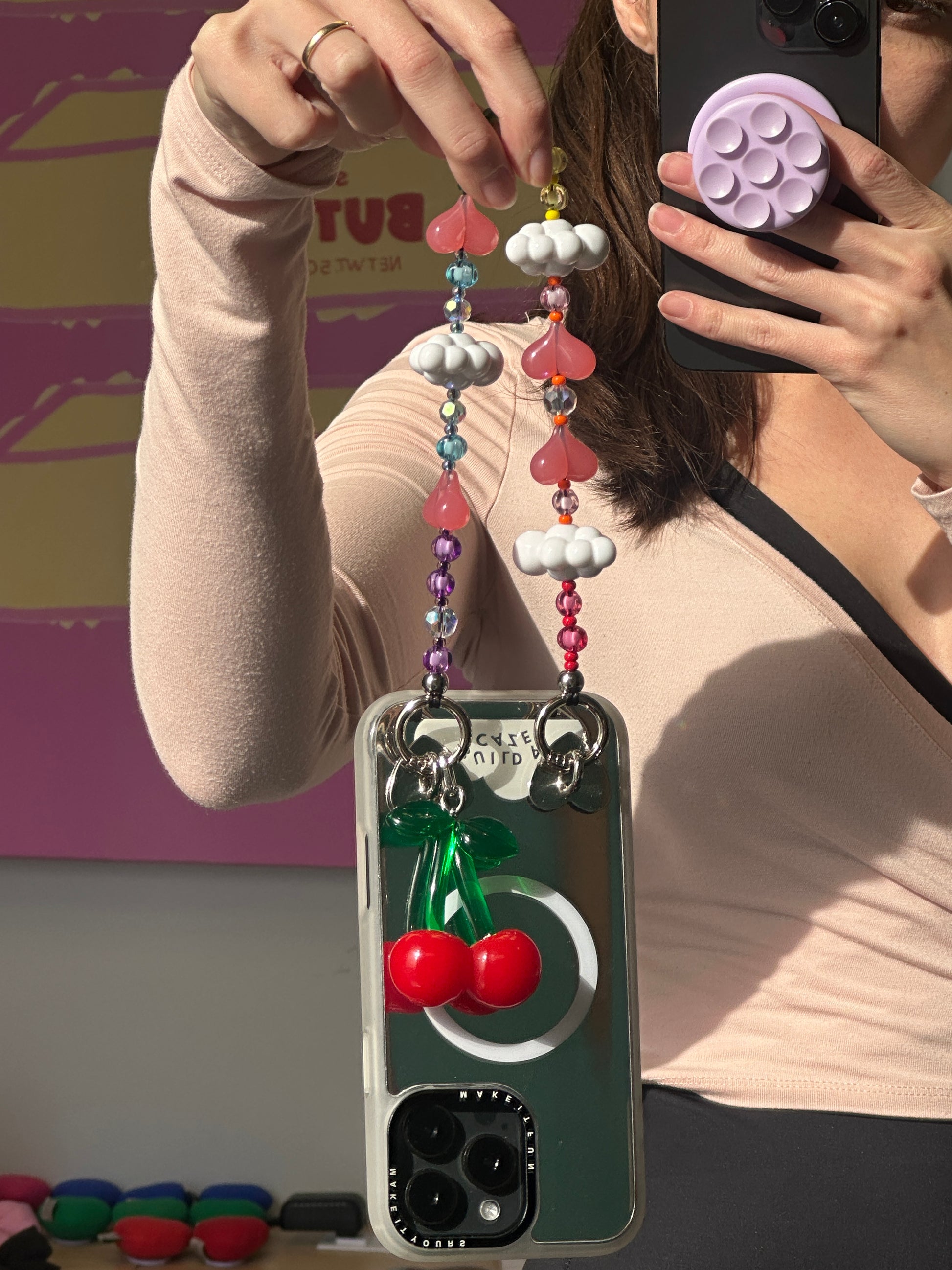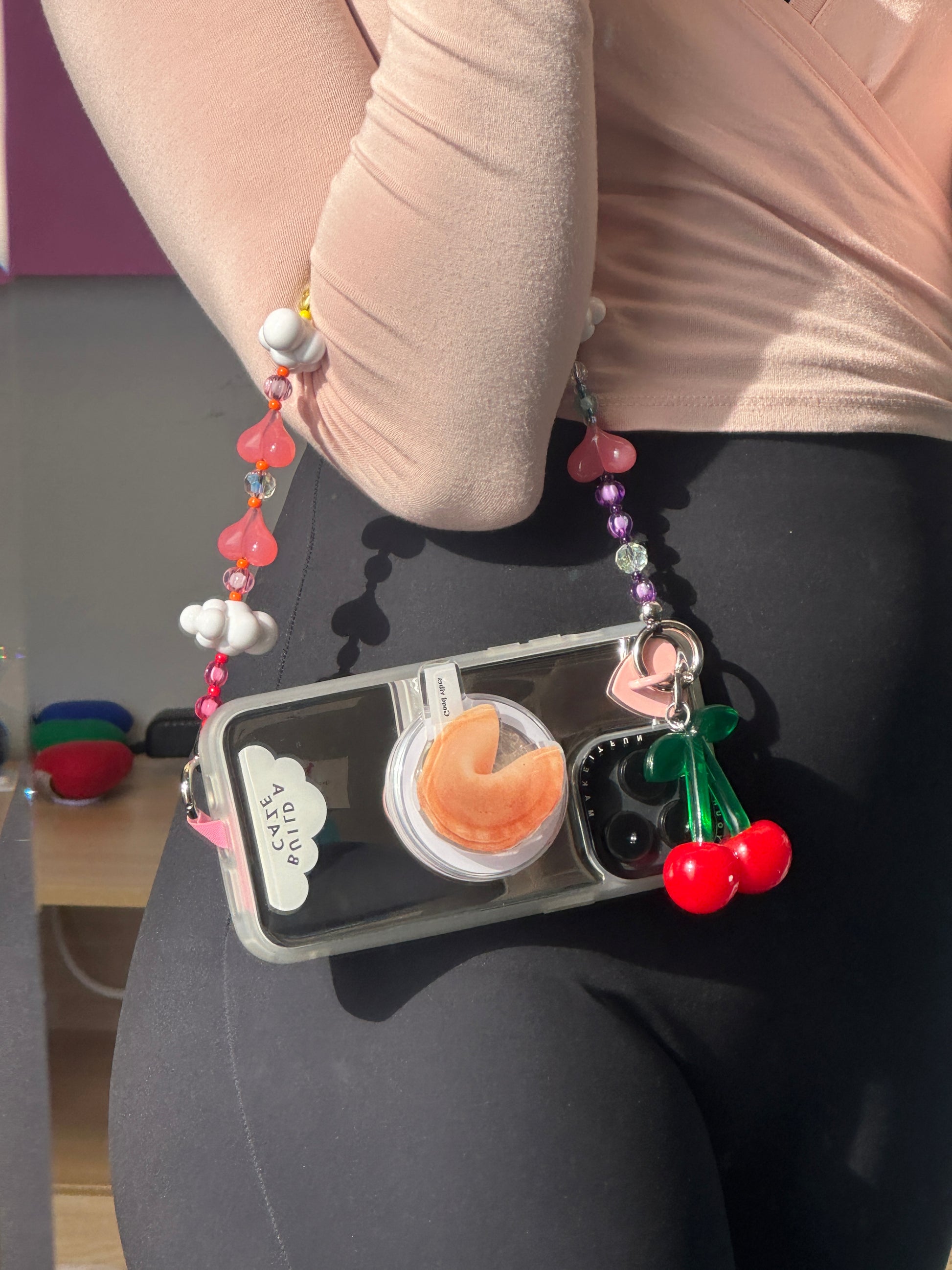 Wear it as a wristlet, short shoulder strap, or purse-style accessory—perfect for errands, nights out, or when you just want your phone close and cute. Finished with pastel beads, rainbow tones, and cloud details, it’s the strap that feels like a purse and styles like a charm.